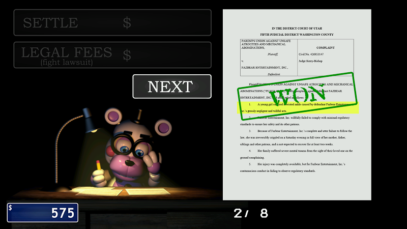 Compared to the other works in the series, the difficulty of FNaF 6 is progressive. In Business mode, players need to allocate funds and resources wisely and strategically choose investments, which can affect the difficulty of night survival mode. During the night, players face rising challenges that come from increasing threats and the difficulty of managing them. This depth and complexity of the game provide no small satisfaction for players who enjoy strategy and challenge.
